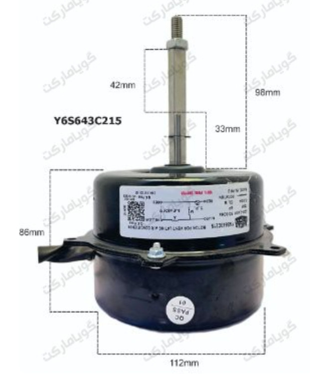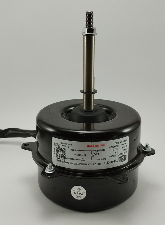 این موتور فن 75 وات و 6 قطبی، مختص نصب در یونیت بیرونی یا کندانسور کولرهای گازی و اسپلیت کنوود، جنرال گلد، سوپر جنرال و تراست طراحی شده است. جریان کاری آن 220VAC 50Hz بوده و آمپر نامی آن 0.68A میباشد. ظرفیت خازن راهاندازی که این قطعه نیاز دارد نیز، 5 میکروفاراد با ولتاژ 450 ولت است. طول بدنۀ موتور فن و میلۀ شافت بهکاررفته در آن، هردو برابر با 90 میلیمتر بوده و قطر شافت تعبیهشده در این تجهیز 12 میلیمتر میباشد. گفتنی است که جنس سیمپیچ این قطعه مس خالص است و جهت حرکت پرههای موجود در آن ساعتگرد میباشد.